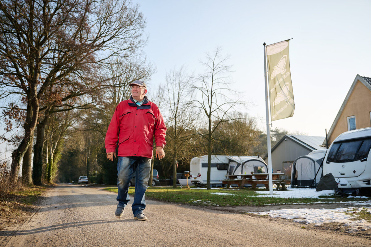 ‘Je kunt ons hier op de camping uittekenen’, zegt André Koot over zijn zoon en hemzelf. ‘We zijn hier áltijd. En mochten we toch even weg zijn, dan zijn we naar de bouwmarkt spullen halen om de camping te verbeteren.’ Het mag duidelijk zijn, vader en zoon Koot zijn graag bezig. André is 77 jaar en al 17 jaar met pensioen, maar op de bank zitten wil hij niet. Hij kocht Camping de Groene Valk in het Drentse Zeegse in 2018. ‘Mijn vrouw was toen net overleden en onze zoon had het best pittig in ons diamantboor-bedrijf, want dat is fysiek zwaar werk. ‘Dit hou ik niet tot mijn 70ste vol’, zei hij me.’ Omdat het gezin altijd erg had genoten van kamperen en André al ervaring had als campingbeheerder, opperde hij om ‘ergens een camping op de kop te tikken’. Met als doel: met zijn tweeën de camping klaarmaken voor de toekomst, zodat Frank een gezond bedrijf heeft als André over een tijd ook ónofficieel met pensioen gaat.